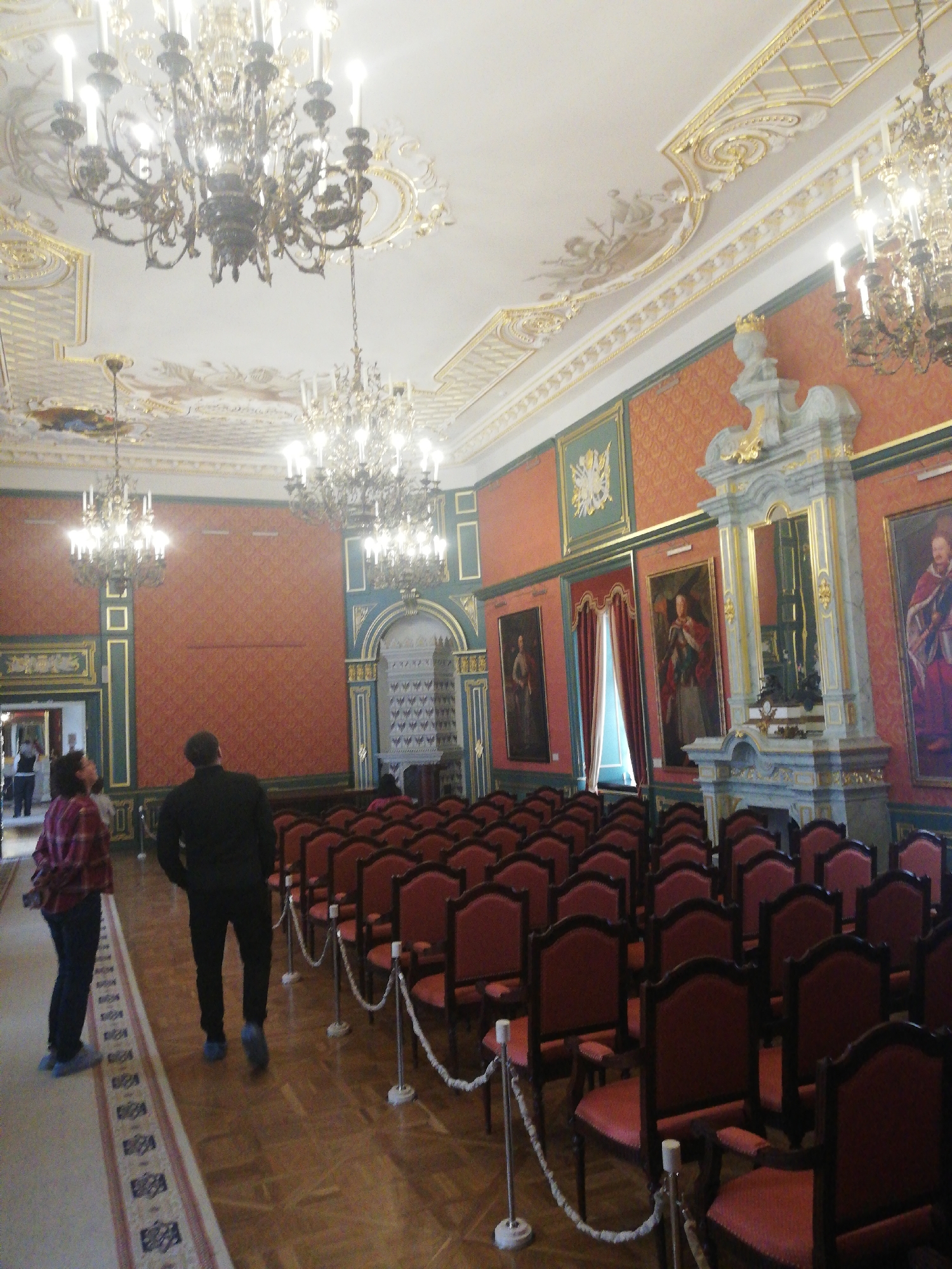 The image depicts the Grand Meeting Hall within the Nesvizh Castle in Nyasvizh, Belarus. The hall features a high white ceiling adorned with elaborate gold rococo-style stucco, intricate moldings, and subtle painted frescoes. Multiple large, ornate chandeliers, predominantly in dark metal with numerous light sources, illuminate the space. The walls are covered in red patterned wallpaper, framed by dark teal and gold trim panels. Several large, framed oil portraits depicting historical figures hang on the walls. On the right side of the room, a prominent light-colored marble or stone fireplace mantelpiece, featuring gold accents and a framed mirror, stands against the wall. To its left, a tall window is draped with red velvet curtains. Rows of dark wood chairs with red upholstered seats are arranged in an auditorium-style configuration, facing away from the camera, partially cordoned off by white rope barriers on stands. The floor is composed of polished wooden parquet, with a patterned rug visible on the left side leading towards a doorway. In the foreground, two individuals are visible from behind. One person on the left wears a red plaid shirt, dark pants, and light-colored shoes, looking upwards. Another person in the center wears a dark long-sleeved top, dark pants, and dark shoes, walking further into the room and also looking upwards. A third individual is partially visible in the brightly lit doorway on the far left.