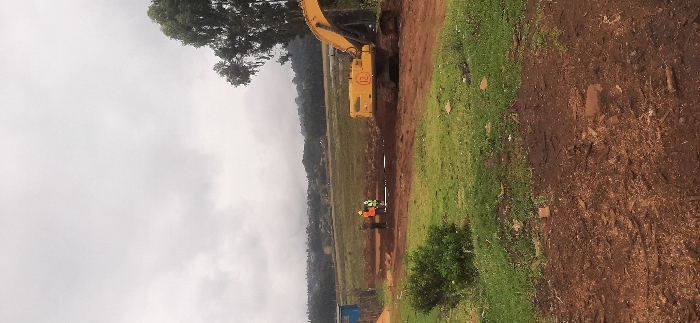 A construction scene under a cloudy sky shows a yellow excavator working alongside a dirt road. Two figures in orange and green vests stand nearby, possibly workers overseeing the operation. The landscape includes a grassy field stretching out behind them, with some trees visible in the background. The foreground consists of a mix of grass and exposed dirt, suggesting recent excavation or ground disturbance.