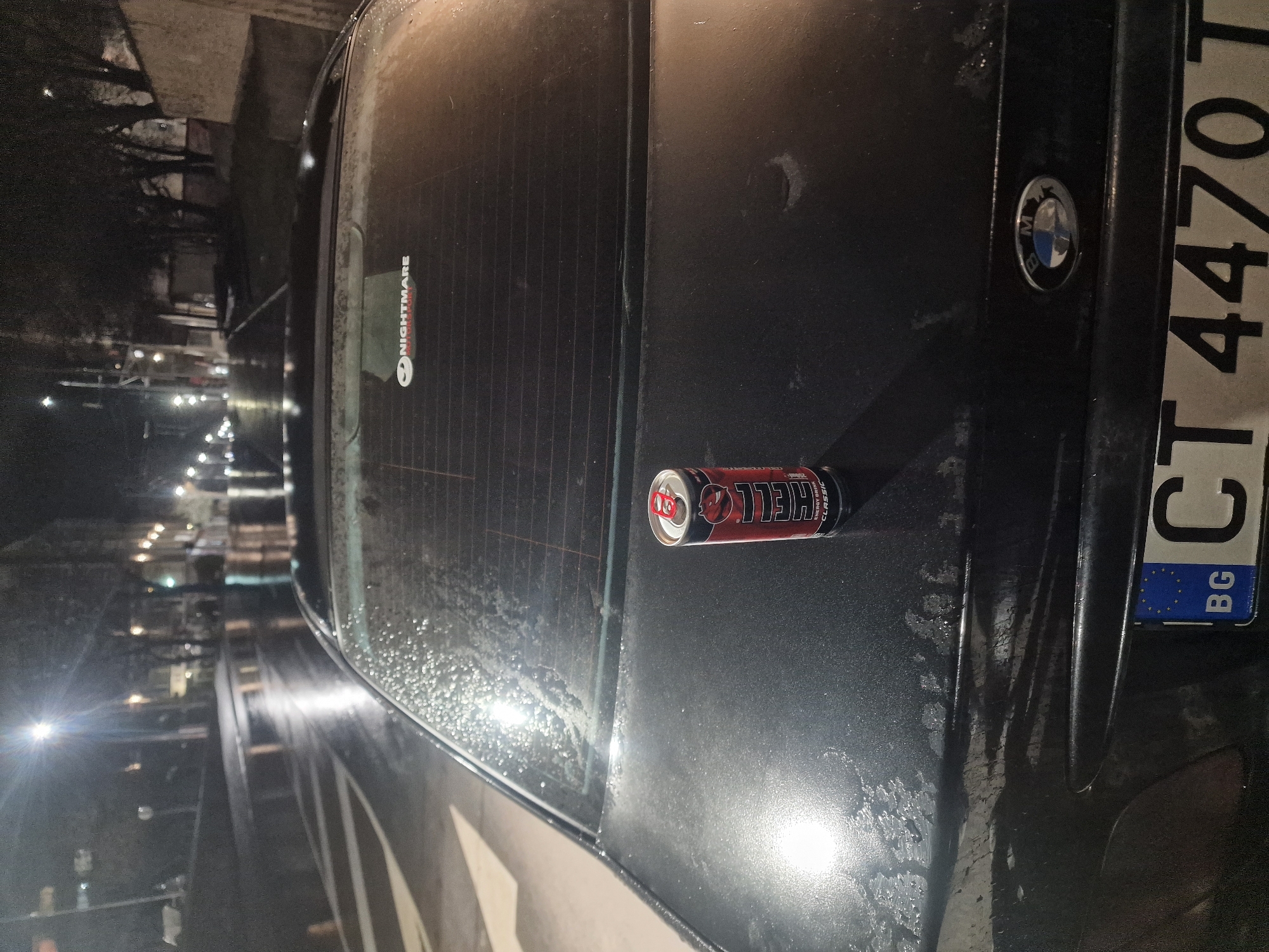 The image depicts a nighttime, wet urban street scene in a city in Bulgaria. The primary subject is the rear of a black BMW sedan, parked on the wet asphalt. A single red and black Hell Classic energy drink can stands upright on the center of the car's trunk lid. The trunk lid and rear window are visibly wet with water droplets; the trunk's paint shows some wear. A white rectangular sticker with the text "NIGHTMARE" and a stylized smiling/grinning face icon is affixed to the upper right section of the rear window. A Bulgarian license plate, displaying the characters "CT 4470 T" with a "BG" Euroband, is mounted on the lower rear of the vehicle, below the circular BMW emblem. In the background, the wet street reflects light from multiple distant streetlights. A white crosswalk marking is visible on the street to the left of the car. Indistinct buildings and trees line the street in the far background. No individuals are visible, and no active interactions or actions are occurring.