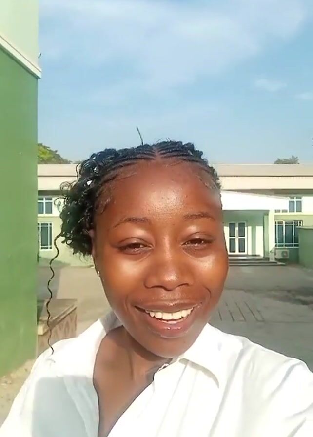 woman with dark skin and braided hair, wearing a white shirt, standing outside a building with green accents and a blue sky in the background