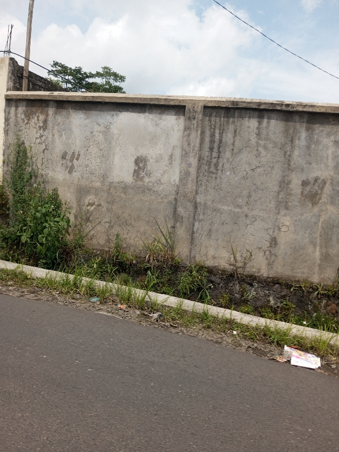 The image depicts an outdoor scene in Cibodas, Indonesia, featuring a weathered concrete wall, a roadway, and surrounding vegetation under a cloudy sky