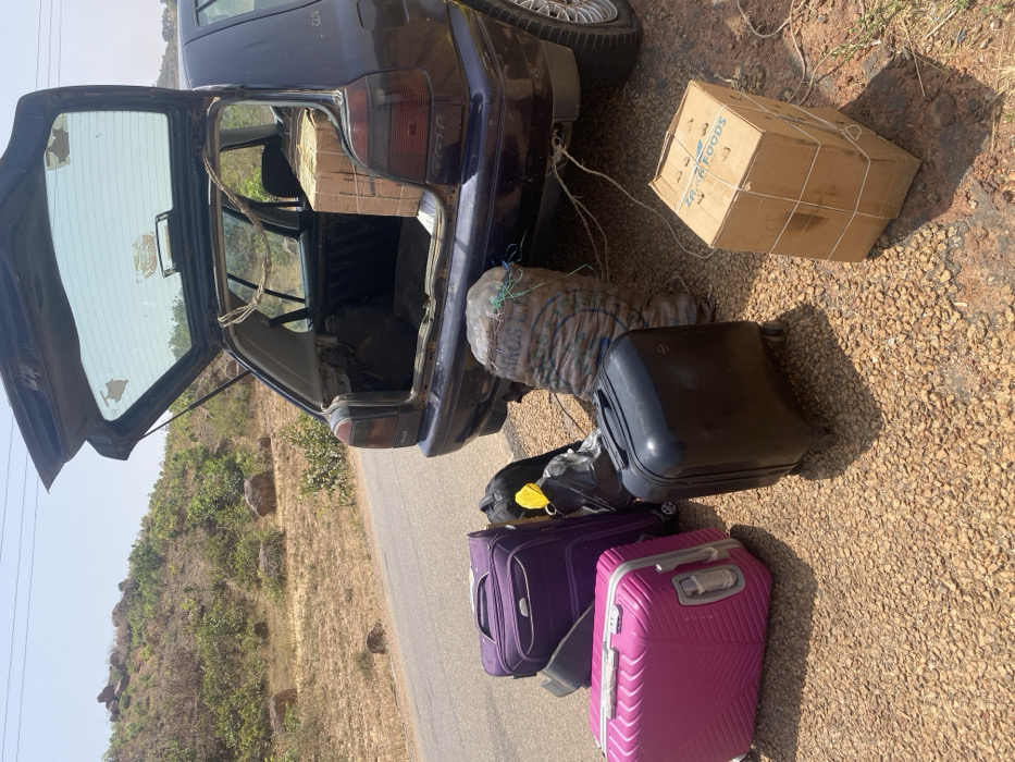 In Ganawuri, Nigeria, a dark-colored hatchback vehicle, possibly a Volkswagen Golf, is stationary on the gravel shoulder of a paved road. The vehicle's rear hatch is open, revealing stacked cardboard boxes within the cargo area. The rear bumper exhibits damage. On the ground adjacent to the car, a collection of luggage and cargo is arranged. This includes one large pink hardshell suitcase, one large purple soft-shell suitcase, and one small black hardshell carry-on suitcase. A black soft bag containing a yellow item is partially visible. A large, upright, cylindrical sack filled with an unidentified lumpy substance, secured with netting, rests near the car's rear. Beside it, a brown cardboard box labeled "ZARA FOODS," bound with white twine, is present. The immediate environment features a dry, rocky hillside with sparse vegetation under a clear sky. No individuals are depicted.