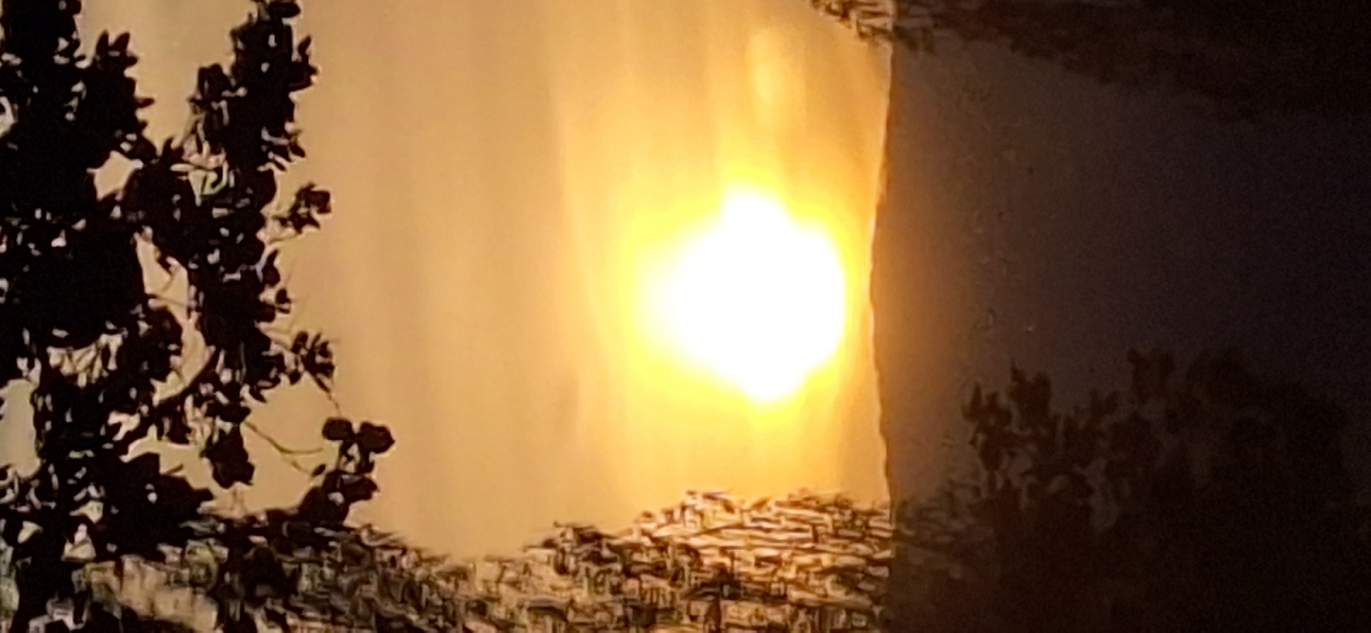 The image appears to be an outdoor scene capturing a bright light source, possibly the sun or a strong artificial light, reflecting on a body of water. The light is illuminating the sky and casting a golden hue. Silhouetted against the bright background is foliage, potentially a tree branch with leaves. Without any landmarks, street signs, or other identifiable features, it is impossible to determine if the image was taken in Blagoevgrad, Bulgaria, or any specific location. The scene lacks context beyond a bright light, water, and foliage.