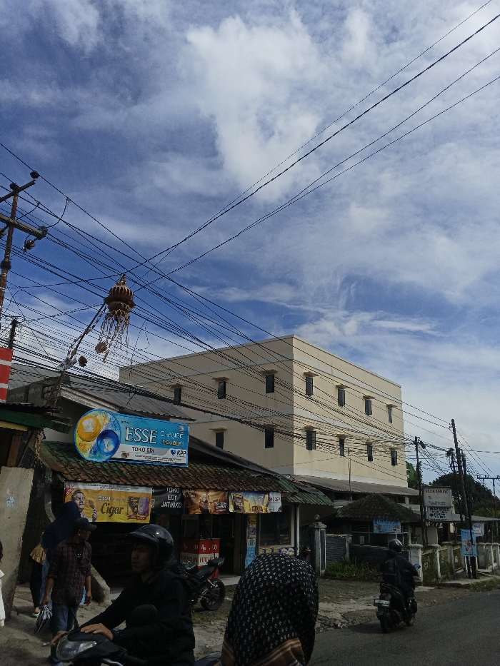 This image depicts a bustling street scene in what is identified as ឃុំ ផាត់សណ្ដាយ, Cambodia, under a bright blue sky with scattered white clouds. A dense network of black electrical and communication wires crisscrosses the upper half of the frame, originating from multiple utility poles, one prominent on the left. In the mid-ground, a multi-story, light-beige building with a flat roof features multiple dark, rectangular windows arranged in horizontal rows. In front of this, a single-story shop with a corrugated metal roof is visible on the left. Above this shop, a large circular blue and yellow sign advertises "ESSE CHANGE DOUBLE" and includes the text "TOKO EDI" (Store Edi) and "KAP", with further visible signage below reading "TOKO EDY JATIMUDO". These signs feature Indonesian language. A decorative, ornate brown lantern-like object with dangling elements hangs from an overhead wire near the left utility pole. On the paved street in the foreground, a person wearing a dark top and a black helmet is seated on a scooter, partially obscured. Directly in front of the viewer, the back of a person wearing a patterned head covering and dark clothing is visible, positioned on what appears to be another scooter or as a passenger. Further down the road on the right, another individual on a dark scooter, wearing a helmet, travels away from the viewer. Several pedestrians are visible near the shop on the left, including one in a blue hoodie and another in a plaid shirt. The right side of the street features a low wall and some green foliage, with another partially visible sign reading "AL ZAZOUK".