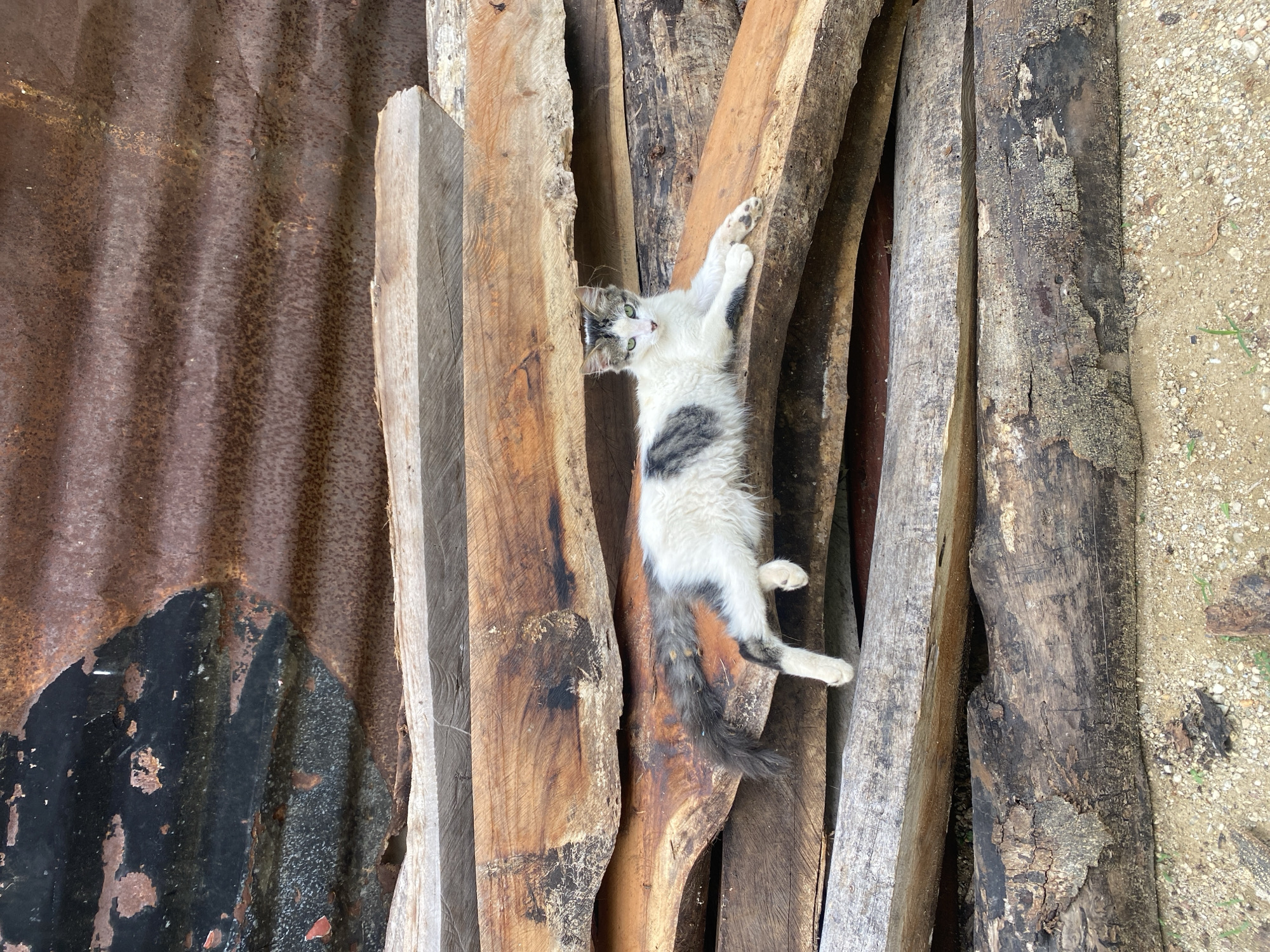 - "A partially obscured view shows a white, black and grey patched domestic cat lying on its back amidst stacked rough-hewn planks of wood" by FM-GIPAv2, licensed under CC BY 4.0