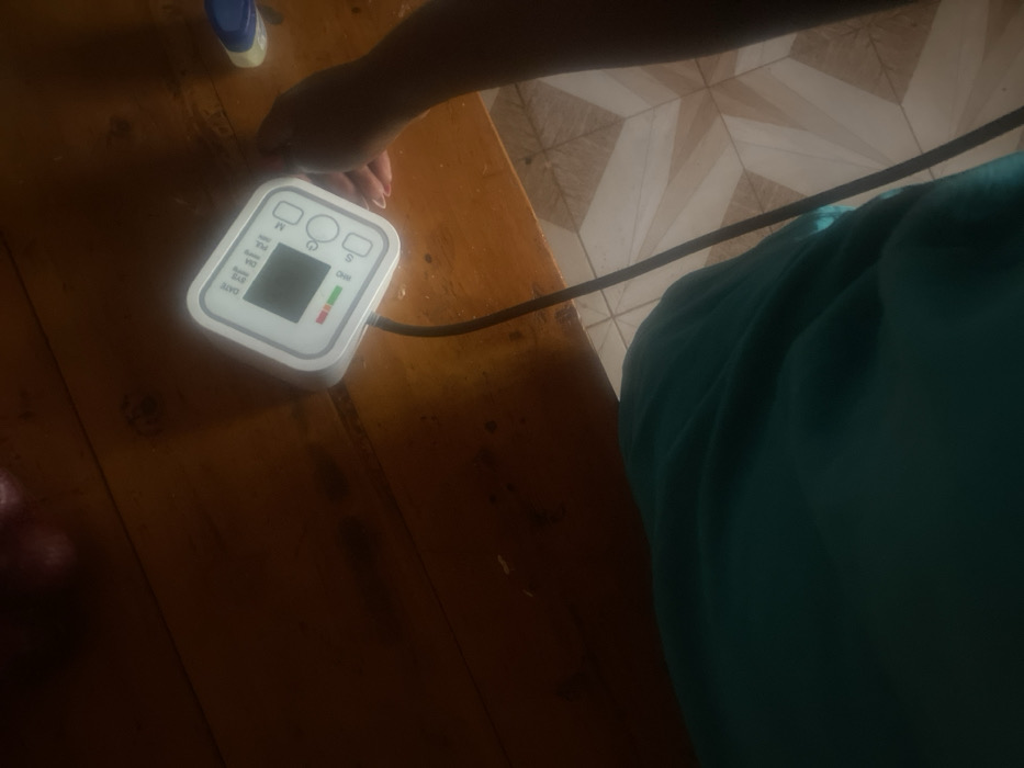 A high-angle indoor shot captures a digital blood pressure monitor on a wooden surface in Kabare, Kenya
