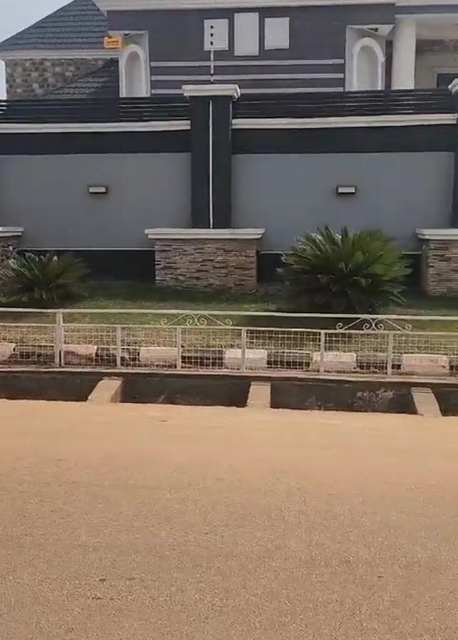 The camera faces a modern two-story house with a gray roof, a gray wall, and black columns. There are stone accents on the wall and a security fence in front of the wall, which is set off by grass and a palm tree. The house is on a street that has drainage canals.