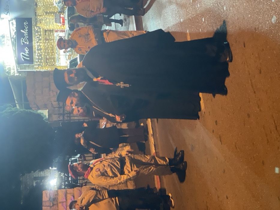 The image displays an outdoor nighttime scene on a paved street in Haifa, Israel, identified as Sderot Ben Gurion 5 in the German Colony, in front of "The Baker" bakery. The street surface appears damp. In the immediate foreground, center-right, two men in black clerical robes and hats stand. The man closer to the viewer has a beard and mustache, and wears a silver-colored pectoral cross suspended on a chain, visible over a red and gold liturgical vestment beneath his black robe. He looks directly forward. The second clergyman stands slightly behind and to the left of the first, also bearded, in a black robe and hat, with a pectoral cross visible. To the left, a man in a light tan uniform, red beret, red neckerchief, and black combat boots stands in profile, facing right. His uniform features discernible patches or insignia on the shoulder and chest. Further into the background, another individual wearing a similar tan uniform and red beret is visible on the right. Additional individuals in tan uniforms are partially visible on the far left. In the mid-ground, left-center, two individuals are depicted embracing. The background consists of stone-faced buildings. "The Baker" bakery is prominent, identified by its illuminated sign and adorned with multiple strings of decorative lights. Other signs featuring Hebrew text are present. A decorative metal gate is visible on the left side of the frame. The scene includes multiple individuals, indicating a public gathering or event.