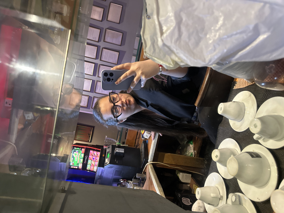 The image depicts an indoor scene within a commercial establishment, likely a cafe or bar, located in Primorsko, Bulgaria. The central subject is a female individual, appearing in her reflection, captured in a mirror selfie. She has long, dark hair, wears dark-rimmed eyeglasses, and is dressed in a dark blazer or jacket over a dark garment with dark pants. On her left wrist, she wears bracelets consisting of red and white beads. Her lips are pursed in a pout as she holds a light-colored smartphone, equipped with a triple-lens camera, in her right hand to take the photograph. In the immediate foreground, within the mirror's reflection, multiple white ceramic coffee cups and saucers are arranged on a dark surface; some cups are inverted, and at least one displays "EVRO" branding. A white plastic bag is partially visible on the far right. The background of the reflection reveals further details of the establishment. To the left of the woman, a black automatic coffee machine stands on a light-colored countertop, accompanied by a silver frothing pitcher and other coffee accessories. Beyond the coffee machine, a brightly lit gambling or slot machine with a colorful digital display and blue side lighting is visible. To the right, a dark wall is adorned with several uniformly framed documents or certificates arranged in rows. The scene suggests a functional, artificially lit interior.