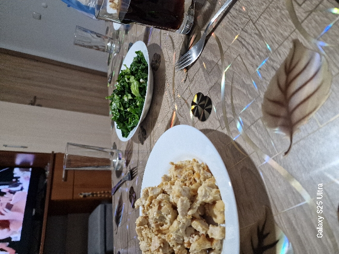 The scene depicts a domestic dining setting, specifically a table prepared with food and beverages, located within a residential interior in the city of Ablanitsa, Bulgaria. In the foreground, a white oval plate holds a serving of light-colored, cubed food, possibly cooked chicken or tofu, mixed with what appears to be scrambled egg or a similar texture. To its right, a white oval bowl contains a fresh green salad. Adjacent to the salad bowl on the right, a clear glass is filled with a dark beverage, likely a soft drink, with ice. Two additional empty clear glasses are positioned further back on the table. Two metallic forks are visible on the patterned tablecloth. The tablecloth features a light brown or beige color with translucent leaf motifs and geometric patterns, exhibiting iridescent light reflections across its surface. A small, round, black and gold decorative object is situated on the tablecloth. The background reveals a television screen displaying a blurred image of what appears to be people in a formal setting, possibly an event or film. The television rests on a brown wooden entertainment unit or cabinet. To the right of the unit, a light-colored wall is visible, along with a closed wooden door. A grey upholstered stool or ottoman is partially visible on the left side, beneath the television. The image includes a "Galaxy S25 Ultra" watermark in the lower-left corner. No individuals are present within the frame.