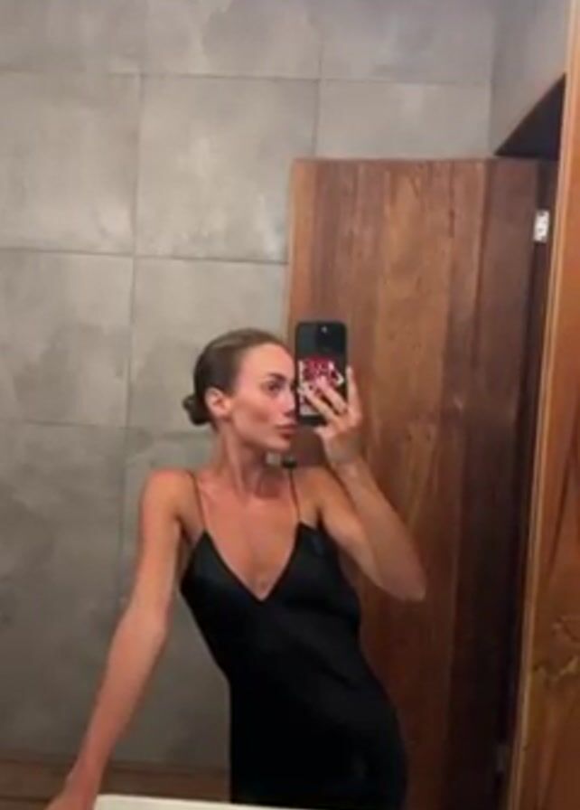 A fair-skinned woman with a bun and a black slip dress is taking a selfie in a bathroom