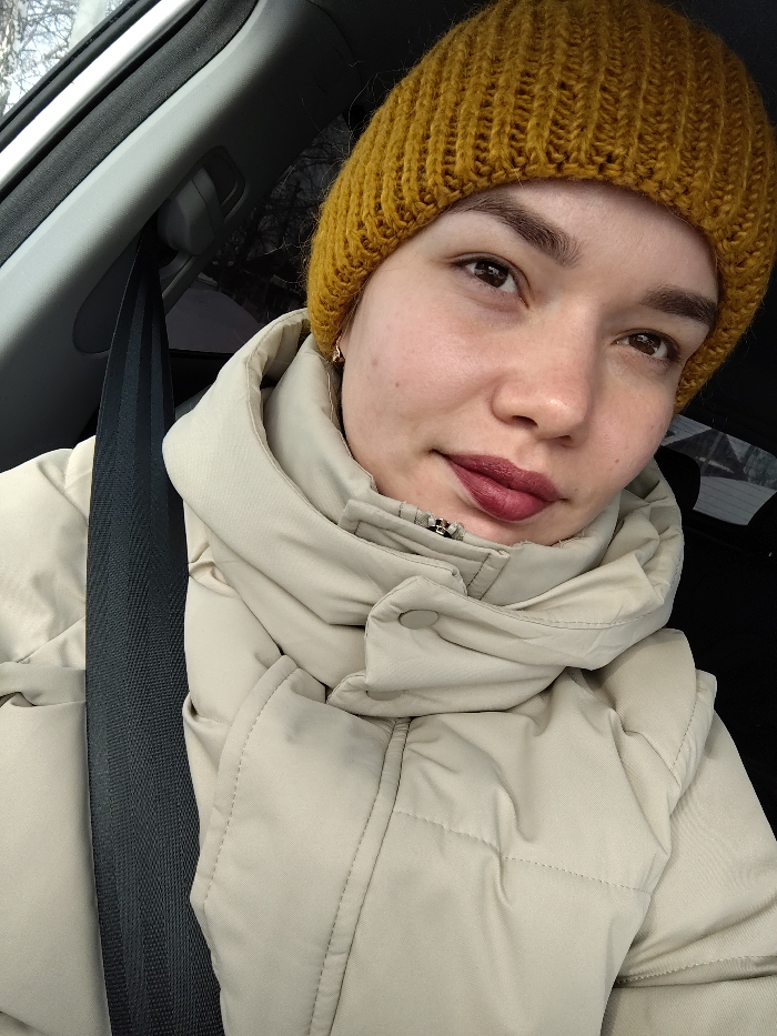 This image captures a woman seated inside a vehicle, located in the city of Elovo, Russia. The woman is positioned directly facing the camera, presenting a close-up, head-and-shoulders portrait. She is wearing a dark yellow, ribbed knit beanie and a light beige, possibly tan, puffer jacket with a high collar that partially covers her lower face. A dark-colored seatbelt is visible diagonally across her chest and left shoulder. Her lips are adorned with reddish-brown lipstick, and a small, gold-colored earring is visible in her left earlobe. Her eyebrows are well-defined. The background within the car shows a grey plastic interior pillar and a grab handle in the upper left. Through the vehicle's window, a blurred outdoor environment, possibly featuring trees and overcast conditions, is discernible, consistent with cool weather attire.