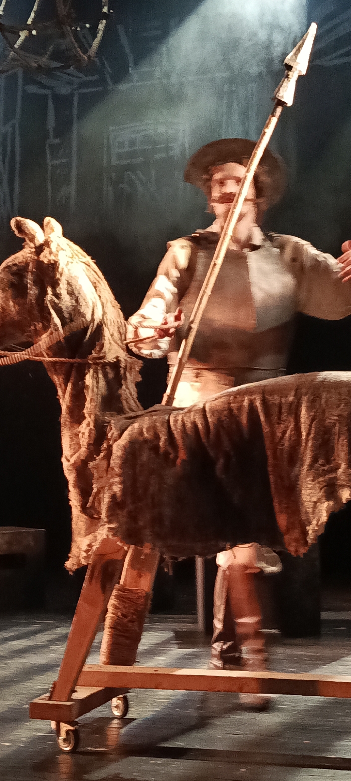 A theatrical scene is depicted on a stage in Novoshakhtinsk, Russia. A performer, identifiable by a dark hat, light-colored tunic, and dark lower garments, is positioned centrally. The individual holds a long pole with a metallic spearhead angled upwards, and their right hand grasps a rope acting as reins for a prominent horse prop. The horse prop is constructed from a wooden frame, draped in textured brown fabric, and rests on a wheeled wooden base for mobility. The background is a dark stage backdrop with faint, light-toned linear markings resembling abstract sketches or architectural outlines, illuminated by a directed light source from the upper left, creating a hazy atmospheric effect. The stage floor is dark and shows subtle reflections.