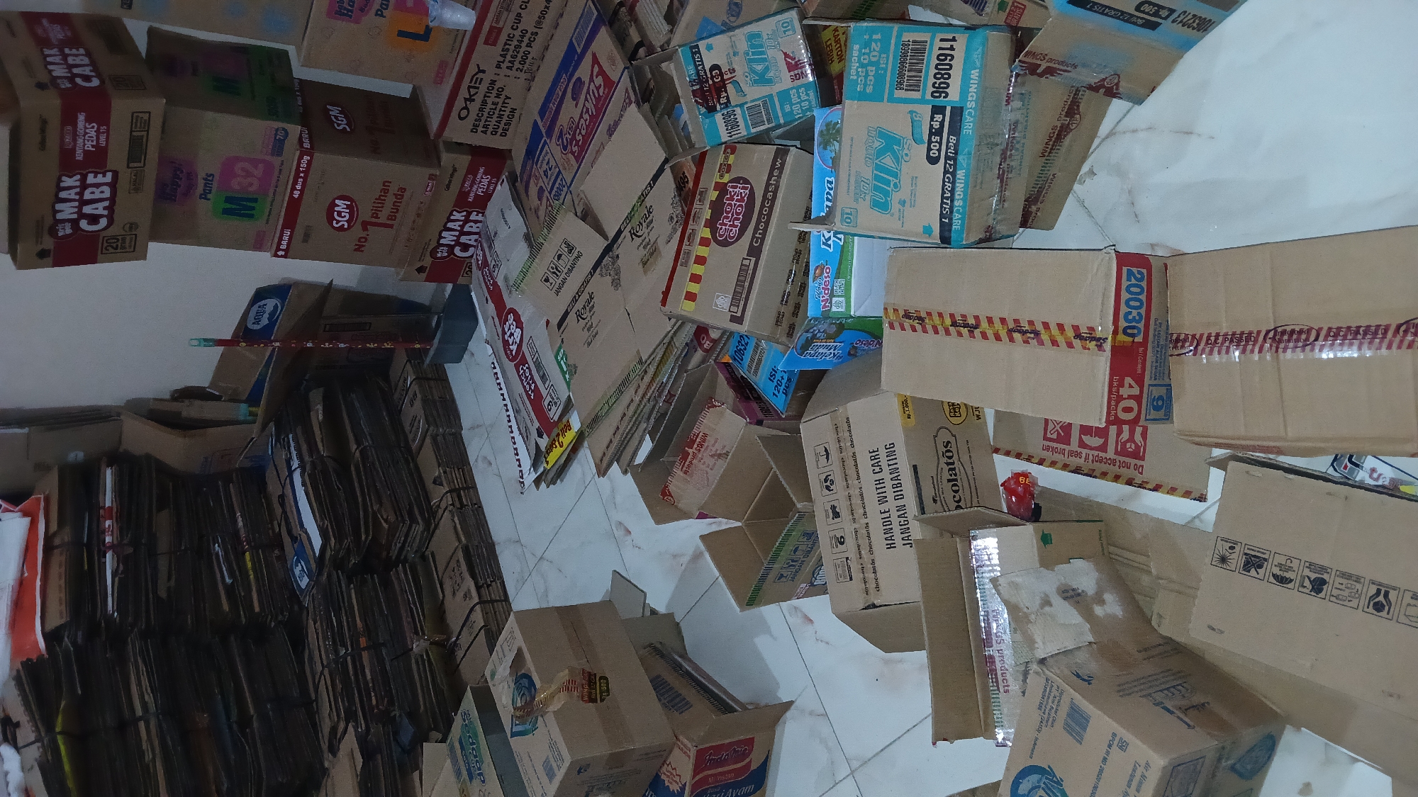 messy interior space filled with numerous cardboard boxes, likely a storage area. Many boxes are printed with brand names like "MAK CABE," "SGM," "OKEY," "AQUA," "Klin," "Chocolatos," and "Indomie," suggesting the contents are food products and household items. Some boxes are stacked, while others are scattered on the tiled floor. A red and white striped broom leans against the wall amongst the boxes. The location is Lhokseumawe, Indonesia, as evidenced by the Indonesian language and local brand names printed on the boxes.