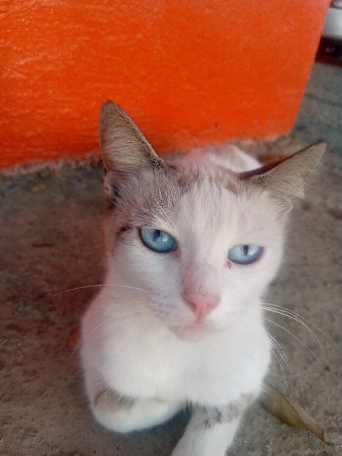 A domestic cat is depicted resting on a light-grey concrete surface in Las Guevaras, Venezuela. The cat is predominantly white with subtle greyish-brown markings on its ears and across the top of its head. It features prominent blue eyes, a pink nose, and visible white whiskers. A small dark mark is present below the cat's right eye. The animal is facing forward, directly toward the viewer. The background consists of a solid orange wall or large object. A dried brown leaf is partially visible on the ground to the lower right of the cat's body.