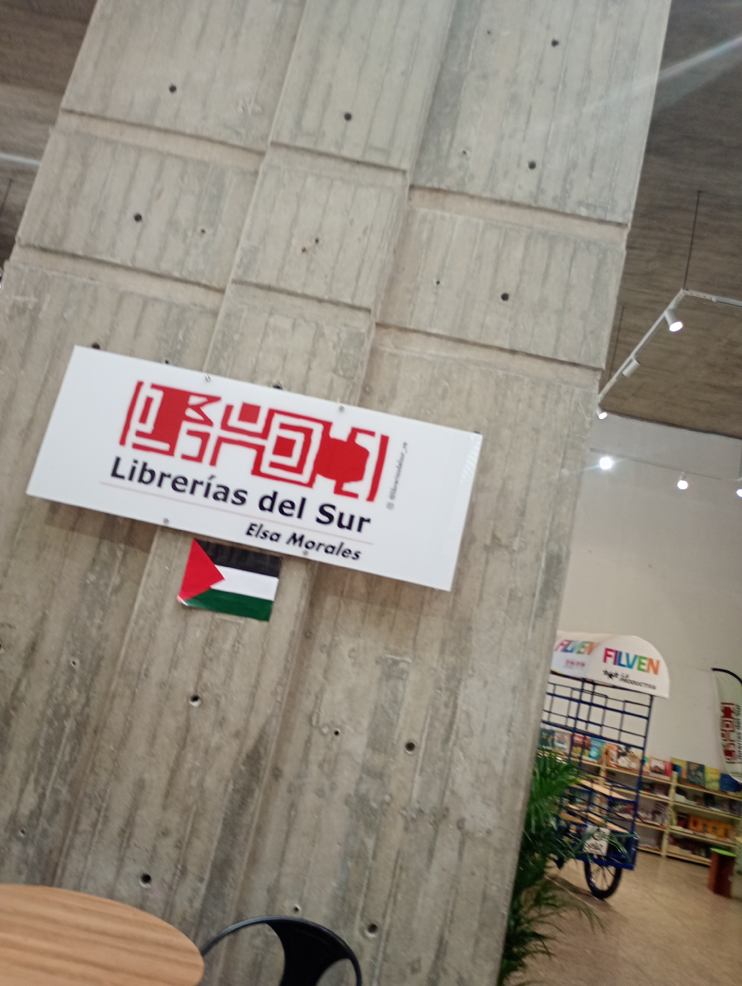 concrete pillar with a sign attached that reads "Librerías del Sur Elsa Morales". A small flag of Palestine is placed below the sign. In the background, a book display cart with the word "FILVEN" is visible. Bookshelves are also seen in the background. A round table and a chair are in the foreground. The scene is located in Caracas, Venezuela, based on the name of the bookstore and the "FILVEN" cart, which is a literary event held there.
