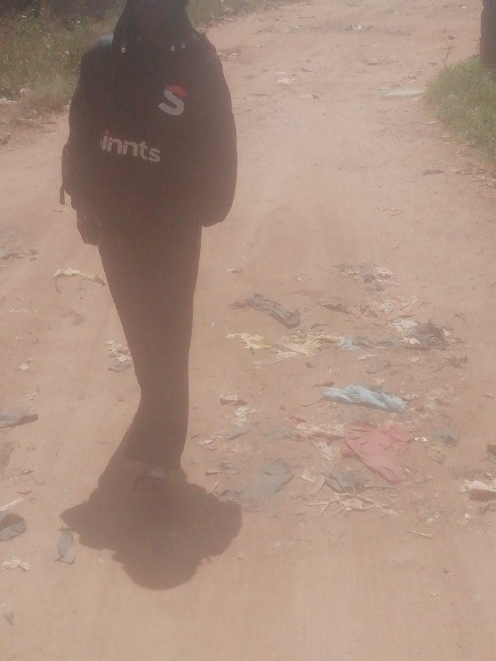 This image depicts a scene on an unpaved dirt path in Jos, Nigeria. A single individual is visible from the mid-torso downwards, positioned slightly left of center and facing away from the camera. The person wears a dark garment, possibly a jacket or backpack, featuring a white stylized 'S' logo with a red accent and the white text 'inntts' beneath it. Dark trousers and dark, possibly laced, footwear are also visible, casting a distinct shadow forward on the ground. The path itself is composed of reddish-brown earth, uneven, and extensively covered with scattered refuse. This debris includes crumpled plastic bags, fragments of light-colored fabrics (notably pale blue, pink, yellow, and white), and other indeterminate litter. Sparse green vegetation lines the edges of the path in the background, particularly on the right side. The scene is illuminated by bright daylight, contributing to a dusty, somewhat hazy atmosphere.