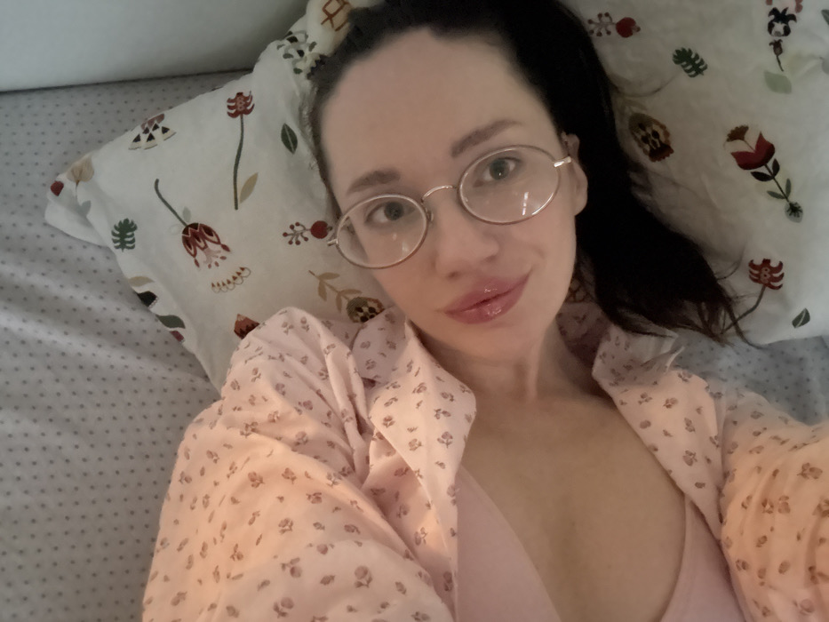 A woman lies on a patterned pillow and bedsheet. She wears round glasses and a pink floral pajama top over a pink undershirt. The light suggests it may be morning or evening. The woman faces the camera with a slight smile, glossy lips, and her hair is pulled back on one side.