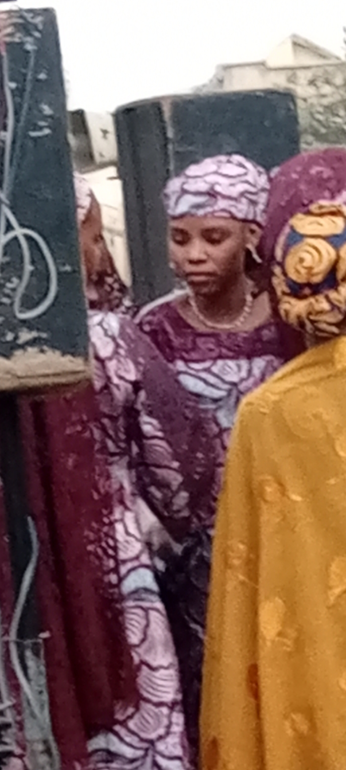 Three women stand in front of two large black speakers. The woman in the center wears a pink and purple head covering and a matching patterned top, with a delicate necklace around her neck. To her right, another woman’s head covering is visible, adorned with a golden pattern. To the left, a third woman is partially obscured by a speaker, clad in a similar patterned outfit. A yellow garment drapes over the right side of the frame. The background shows a building and trees.