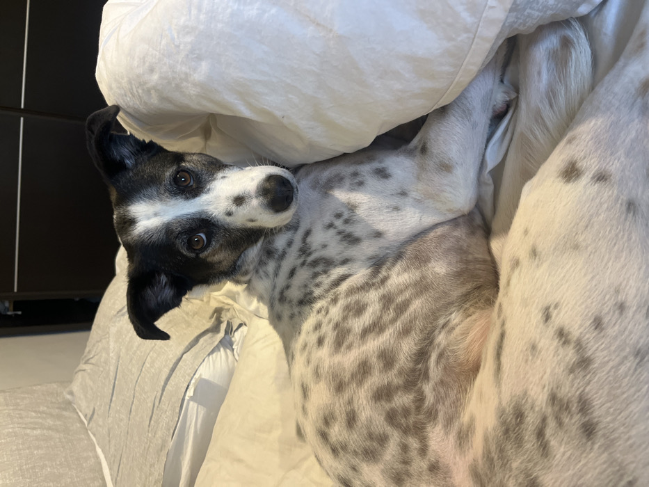 - "A black, white, and brown speckled dog is observed lying on a bed in an indoor residential environment within Ramat Gan, Israel" by FM-iEctz2, licensed under CC BY 4.0