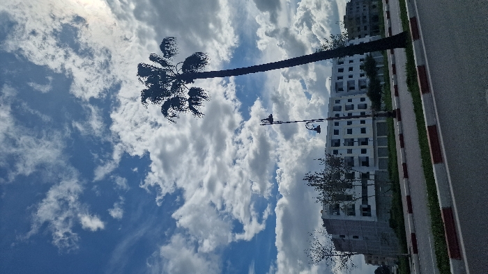 The scene depicts an urban roadside environment in Fez, Morocco, under a partly cloudy blue sky. A tall, dark-silhouetted palm tree with visible fronds stands prominently on the right side of the frame, leaning slightly. To its left, a black, ornate streetlamp with two upward-curving arms, each supporting a luminaire, rises from a vegetated median strip. In the mid-ground, a large, multi-story building with a light-colored, possibly white or light grey, facade appears to be under construction or unfinished, evidenced by numerous dark, rectangular window apertures lacking glass or frames. Several sparse deciduous trees with minimal foliage are situated directly in front of this building. The immediate foreground features a section of a paved road with a solid white edge line, bordering a red-and-white striped concrete curb. A narrow strip of green grass or low vegetation lies between the curb and the buildings. A second, partially visible building of similar construction is situated further back on the right. The scene is devoid of human presence or vehicular traffic.