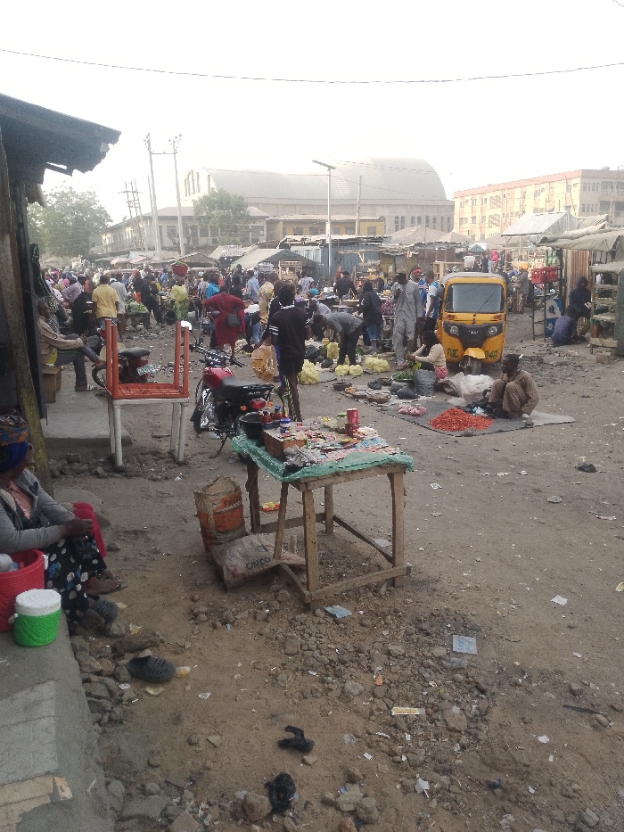 A bustling outdoor market scene unfolds on uneven ground with scattered debris. A yellow three-wheeled vehicle stands amidst the crowd. Tables display various goods, including food and snacks. People gather, some selling produce laid out on the ground. Buildings are visible in the background. A motorcycle is parked near a makeshift stall, and a seated woman watches the activity. The scene suggests a vibrant, yet somewhat chaotic, marketplace.
