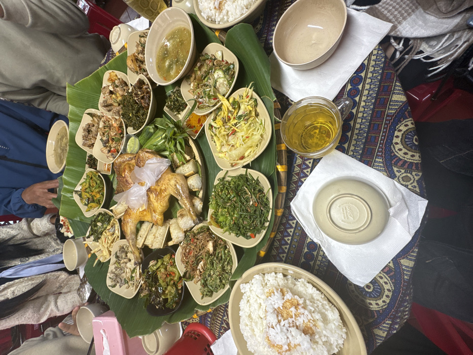 A table laden with a feast. A large, round woven platter is covered in banana leaves, displaying a roasted chicken, tofu, and various dishes of vegetables. The food is served in small bowls and plates. Steaming bowls of rice sit nearby. A clear mug of tea and empty bowls complete the setting. The tablecloth features a colorful, patterned design. Several individuals are seated around the table, seemingly ready to enjoy the meal.