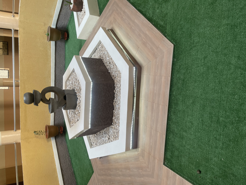 The image displays an interior courtyard or atrium, likely within a commercial, institutional, or residential building in Jos, Nigeria. The central feature is an octagonal, multi-tiered water fountain constructed from grey, stone-like material, featuring three stacked, bowl-shaped elements with a visible power cord. This fountain is centered within a larger, octagonal raised planter that has a dark brown base and a cream-colored top ledge. The top ledge is illuminated by a strip of white LED lights and the planter's interior is filled with light-colored decorative gravel. Immediately surrounding the main octagonal planter is a narrower, cream-colored octagonal border, followed by a light brown, wood-patterned tiled floor. This tiled section also features a strip of white LED lights embedded along its inner edge. The remaining floor area is covered with vibrant green artificial turf. On the artificial turf, to the left of the central fountain, a slender green plant is in a terracotta pot on a red metal stand. To the right, a smaller, square, cream-colored planter box contains light-colored gravel and a small succulent plant. A small, dark, spherical object rests on the artificial turf in the lower-left foreground. The background consists of light yellow/cream-painted walls, with a darker brown lower wall section. A silver-colored metal railing is mounted above the darker section, suggesting an upper floor or walkway. Windows with dark security grilles are visible in the upper wall sections, and a framed artwork hangs on the far wall. The area is well-lit, consistent with both natural light filtering through the windows and the integrated LED strip lighting. No people or discernible activities are present. The precise building or address within Jos, Nigeria, is not identifiable from the visual content.