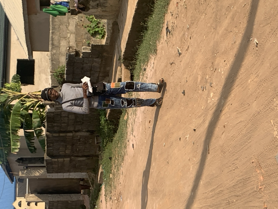 A person stands on a dirt road next to buildings and greenery. The person wears glasses, a dark hat, a grey long-sleeved shirt, ripped jeans with patch accents, and sandals. They hold a white cloth or paper in their left hand. The background shows a mix of constructed walls and foliage, with a variety of textures and colors. A shadow stretches across the dirt road.