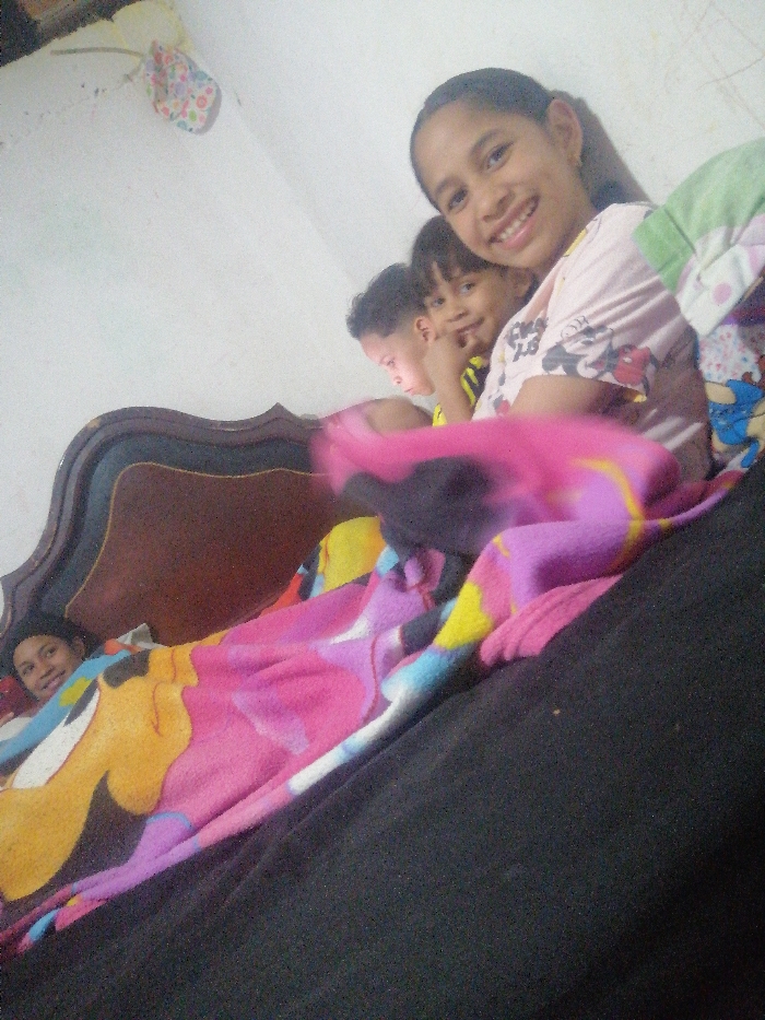 This image depicts an indoor scene, identified as being in Soacha ciudad, Colombia, likely a bedroom. Four individuals are present in a bed. In the foreground, a female with dark hair smiles directly at the camera, wearing a light-colored t-shirt with what appears to be Mickey Mouse graphics. Behind her and to the left, a younger child with dark hair is partially visible, also looking towards the camera with a finger near their mouth, wearing a yellow and black striped top. Further left, a third child, a boy with short dark hair, is visible, looking downwards. On the far left, partially obscured by a colorful blanket and the ornate dark wooden headboard, another individual, possibly an adult, is seen lying down, looking towards the camera with a slight smile. The individuals are covered by multiple blankets, including a prominent pink, purple, yellow, and blue blanket with patterned designs, and another light green and white blanket. The background consists of a plain white wall. An object, possibly a floral-patterned fabric decoration, is partially visible hanging on the upper left wall. The image exhibits a slightly soft focus, suggesting a casual, handheld photograph of a relaxed indoor gathering.