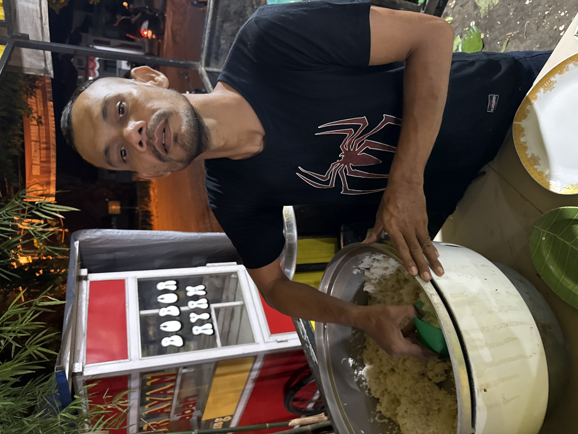 A man, appearing to be in his 30s or 40s with a close-cropped haircut and short beard, is seen from the chest up, looking directly at the camera with a neutral expression. He is wearing a dark blue or black t-shirt with a red and white Spider-Man logo on the chest. His right arm is extended into a large, silver-colored pot filled with what appears to be a light-colored, granular food substance, possibly rice or porridge. He is holding a green scoop or utensil in his right hand. His left hand rests on the rim of the pot. The scene takes place outdoors at night, indicated by the dark background and artificial lighting. Behind the man, to his left, is a red and white street food cart. Visible text on the cart includes "BOBOR AYAM" (Chicken Porridge) in white lettering with a black outline, and partially visible "RAYAN" on the side. The cart has a metallic frame and is partially covered by a tarp. Overhead, bamboo-like foliage is visible. On a table in the foreground, two plates are present: one green, leaf-shaped plate and one white plate with a gold and white ornamental rim. In the distant background, street lights, faint buildings, and another person on a motorbike are discernible, suggesting a bustling street or market environment in Lhokseumawe, Indonesia.