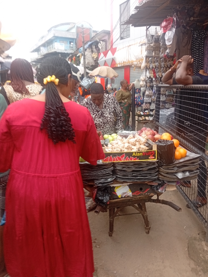 The image depicts a busy open-air market scene in the city of Onitsha, Nigeria. In the immediate foreground, a person is seen from behind, wearing a long-sleeved, knee-length red dress. Their dark braided hair is styled in a ponytail, secured with multiple yellow ties, and the end of the ponytail features curly extensions. Directly in front of this person is a mobile market cart, constructed from wooden elements and metal bars. The cart displays various produce for sale. On top, prominent piles of reddish-purple onions, bright orange oranges, and light-colored tubers (resembling ginger or yams) are arranged in a cardboard box labeled "Alanfruits." Below the produce, multiple stacks of dark, flexible objects, appearing to be plastic mats or trays, are piled on the cart's surface. Behind the market cart, a female vendor with a dark complexion, wearing a black and white leopard-print top, is visible, appearing to attend to the stall. To the right of the vendor, another person in a green patterned dress stands upright. Further to the right, a man is observed lying prone behind a dark metal grate or fence, with his hands covering his face. The background reveals a dense commercial streetscape. Multiple-story buildings, some with red and white geometric patterns, line the street. Various shops and stalls are visible, displaying merchandise such as handbags, clothing, and other goods. The ground surface appears to be unpaved earth or worn concrete. The sky is overcast, indicating a potentially cloudy day. The overall environment suggests an active, crowded urban market setting.