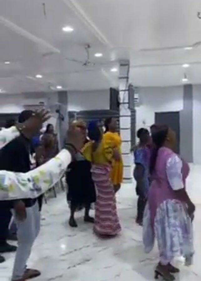 group of people dancing inside a spacious room. The floor is tiled in a marble-like pattern, and the ceiling is white with decorative recessed lighting and a large chandelier. Most of the dancers are women, wearing dresses or skirts in a variety of colors and patterns. One man in a black-and-white patterned shirt is visible among the dancers. Towards the end of the clip, the camera pans towards a slightly elevated platform. A man in a white suit is singing into a microphone, with other individuals standing behind him, including a choir member in a black robe. The setting appears to be a religious celebration, potentially a church or similar event.
