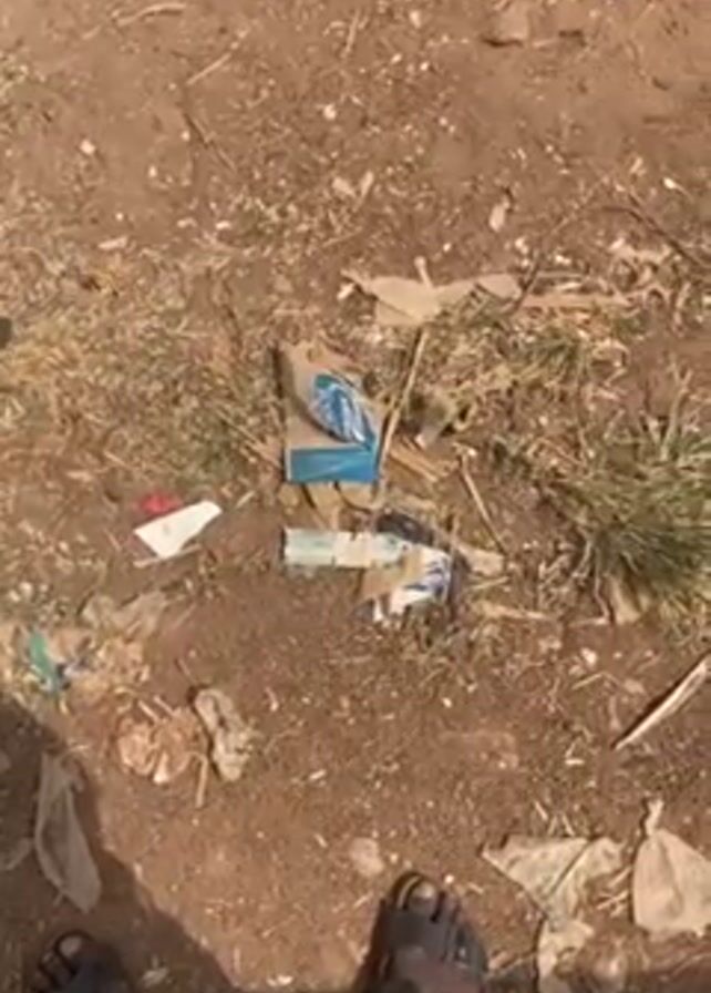 The camera angle is looking down at the ground. The ground is brown dirt with some patches of dry grass, trash, and debris. The trash consists of scraps of plastic, wrappers, and a small blue and white box. The lower portion of a person is in the foreground. They are wearing dark pants and sandals. Their feet are visible.