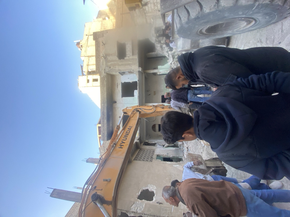 This image captures a demolition or construction site in At-Tall, Syria, under a clear blue sky
