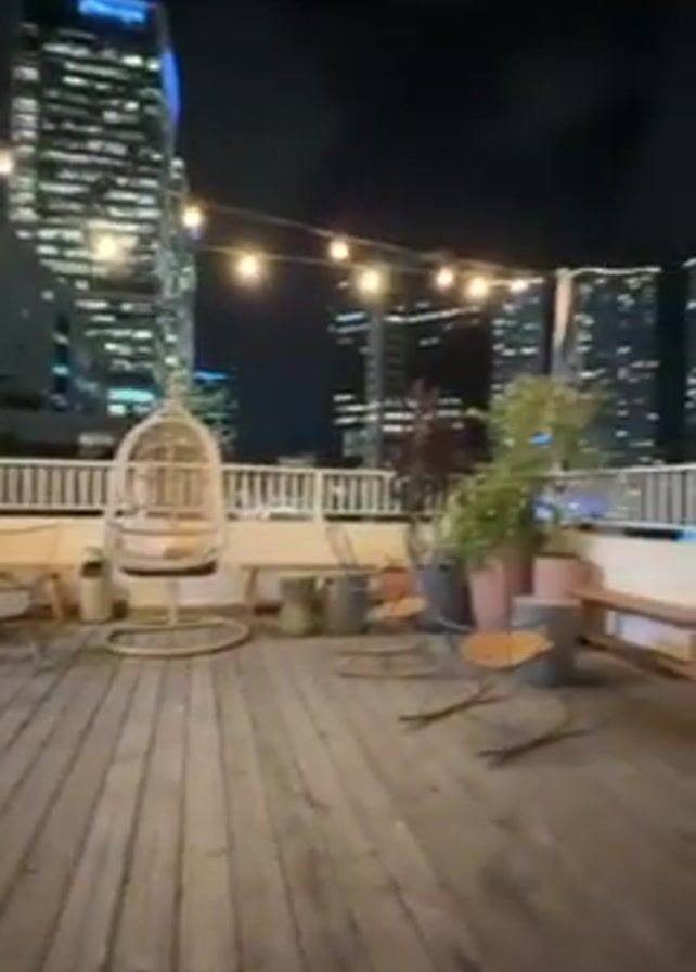 The video showcases a rooftop patio at night, with a wooden deck surface and a white railing outlining the perimeter
