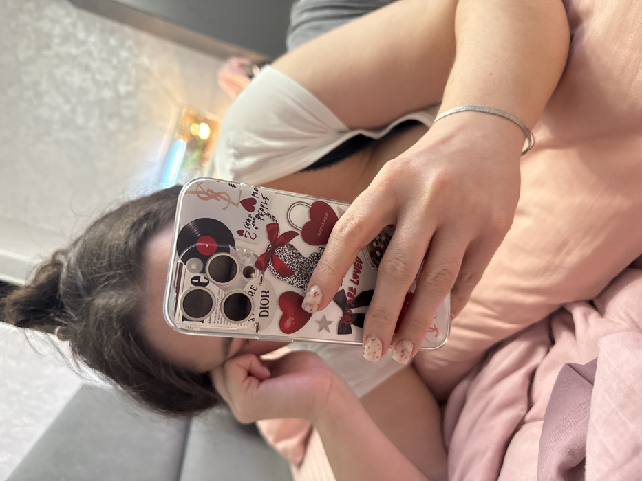 The scene depicts an individual, presumably female, in a relaxed, reclined position, likely indoors in Yakhroma, Russia. The person's upper torso and head are partially visible, with dark hair tied up, and the face obscured as they look down. They are wearing a white short-sleeved top over a black bra, a strap of which is visible. The left hand holds a smartphone in a clear case adorned with various designs including "DIOR," "SAINT LAURENT," red hearts, a leopard print bow, and a vinyl record graphic. The phone case also features text fragments such as "ARE LOVED." The individual's fingernails are manicured with a light-colored, possibly speckled, polish. A silver-colored, flat-linked bracelet is worn on the left wrist. The person is situated amidst light pink bedding or blankets. The background is softly blurred, showing ambient lighting, indicating an interior setting, possibly a bedroom.
