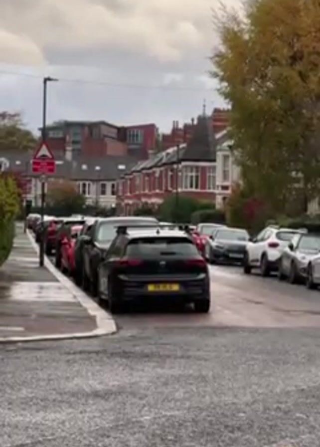 The scene is a street in an urban area. A row of parked cars lines the curb on both sides of the street. The street is wet, suggesting it has recently rained or is currently raining lightly. The cars are a mix of colors and models. In the foreground, a black car with a roof rack is parked. In the background, residential buildings can be seen, showcasing a mix of architectural styles. Trees with changing autumn colors dot the landscape. The sky is overcast, creating a gray and muted atmosphere. A speed bump sign is visible on the left side of the street.