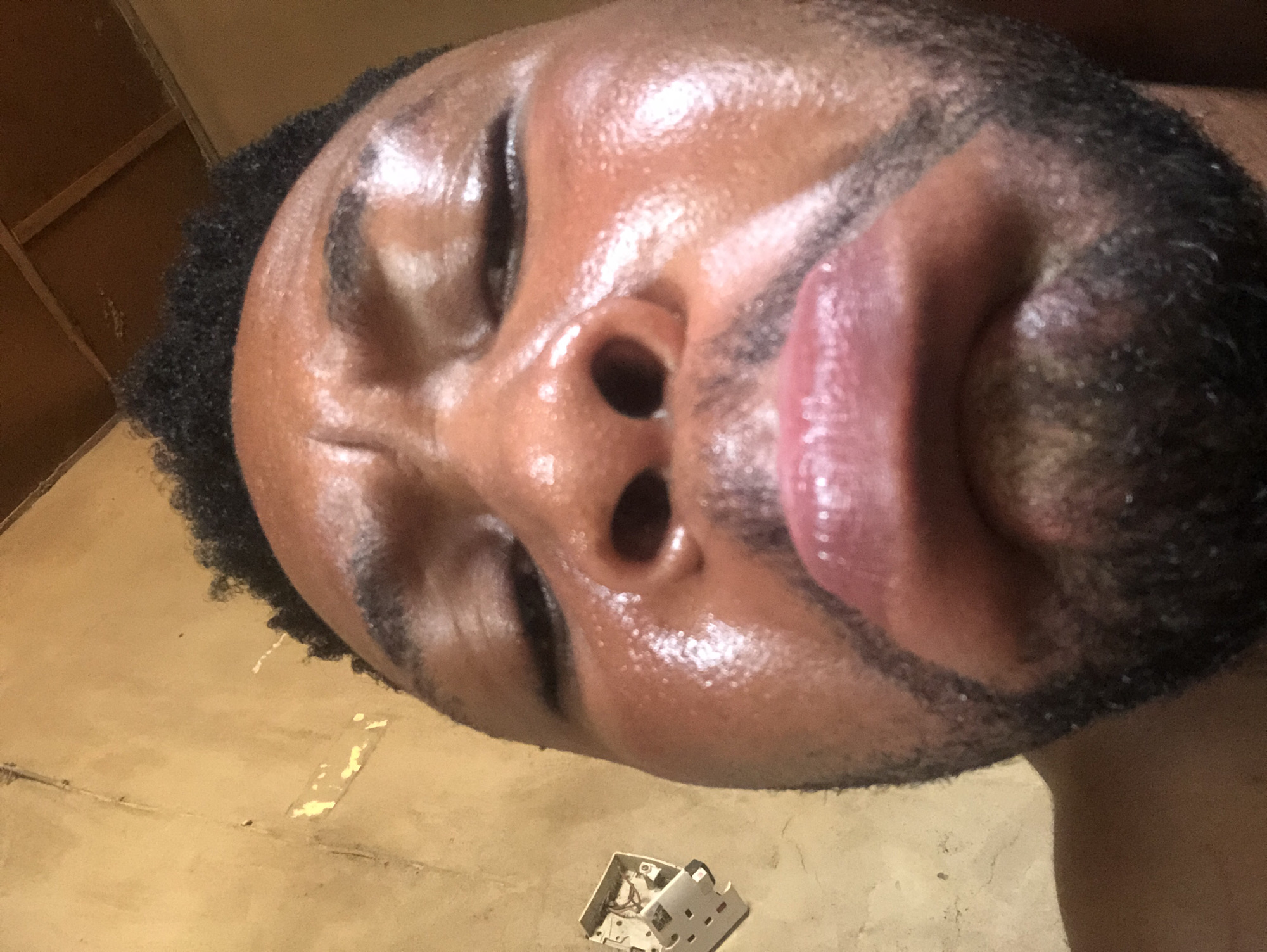 A close-up, low-angle view of a Black man's face dominates the image. The man has dark hair and a beard. His eyes are closed. His skin appears oily or sweaty. In the lower part of the frame, a light switch or electrical outlet, partly pulled from the wall, is visible. The background shows a plain wall. Location: Unknown, Unknown.