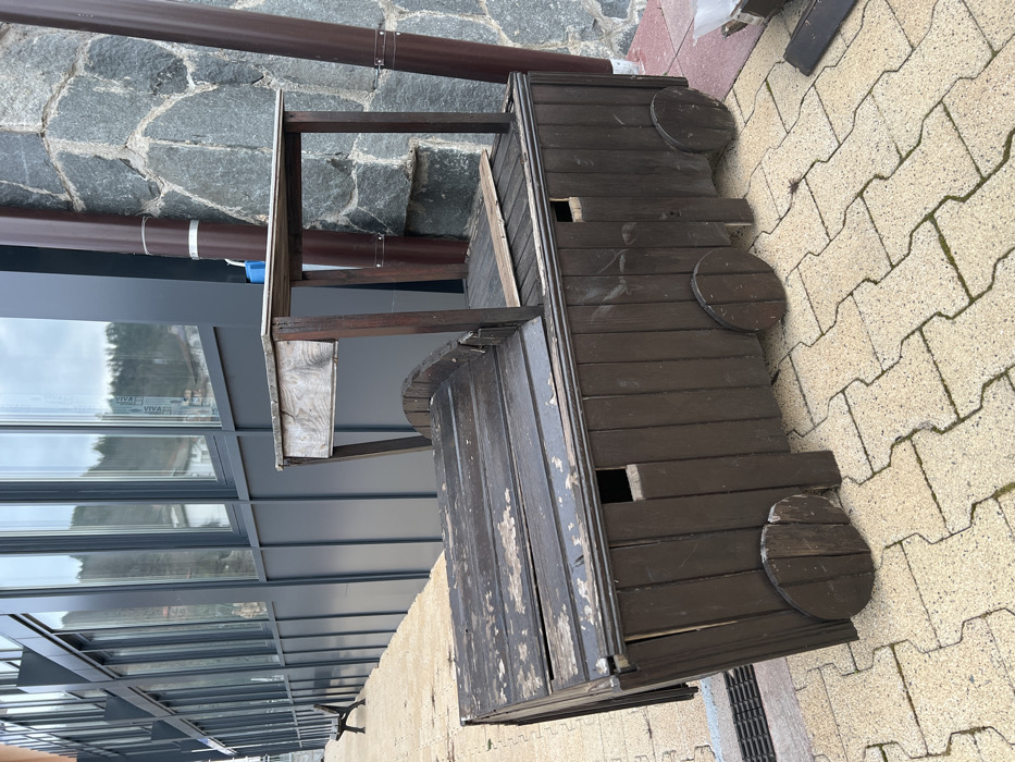 - "The scene, located in Nedelino, Bulgaria, presents a weathered, dark brown wooden structure positioned on an outdoor paved surface" by FM-yFnm82, licensed under CC BY 4.0