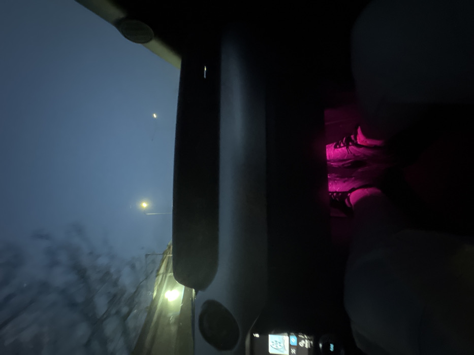 This image captures an interior view from within a vehicle, observed during dusk or nighttime hours in Sofia, Bulgaria. The perspective is directed through the windshield towards a dark blue sky with faint cloud formations, indicating an urban setting. A bright yellow streetlight is prominently visible in the upper-left quadrant, with a second, fainter light appearing further to the right. Inside the vehicle, the dashboard occupies the mid-ground, while a digital display screen, likely part of an infotainment system, is partially visible on the lower-left. The lower extremities of a person, specifically their legs and feet, are visible in the footwell. The individual is wearing dark, lace-up athletic shoes. These shoes and the surrounding footwell area are intensely illuminated by a vibrant pink-magenta ambient lighting source. The blurred nature of the external environment on the left side of the windshield could suggest the vehicle is in motion or experiencing reflections on the glass.