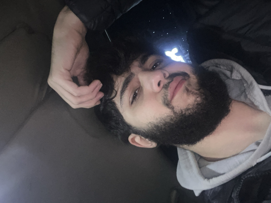 A man with curly, dark hair and a full, dark beard is looking at the camera. He has his hand resting near his hair. He is wearing a hoodie with a white drawstring and a dark jacket. The background is dark, with a blurry bright light in the distance. The photo appears to be taken from an angle, possibly above the subject. The overall tone is relaxed and casual.
