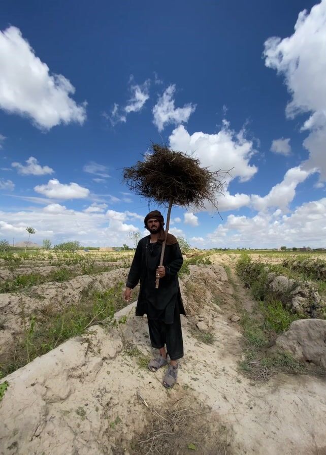 A man stands in a field under a blue sky with fluffy white clouds. He's dressed in dark traditional clothing and holds a staff topped with a large, circular bundle of twigs and dry grass, which acts as an umbrella. The field is uneven, with ridges of dry earth and sparse green vegetation. The scene suggests a rural, possibly arid landscape.