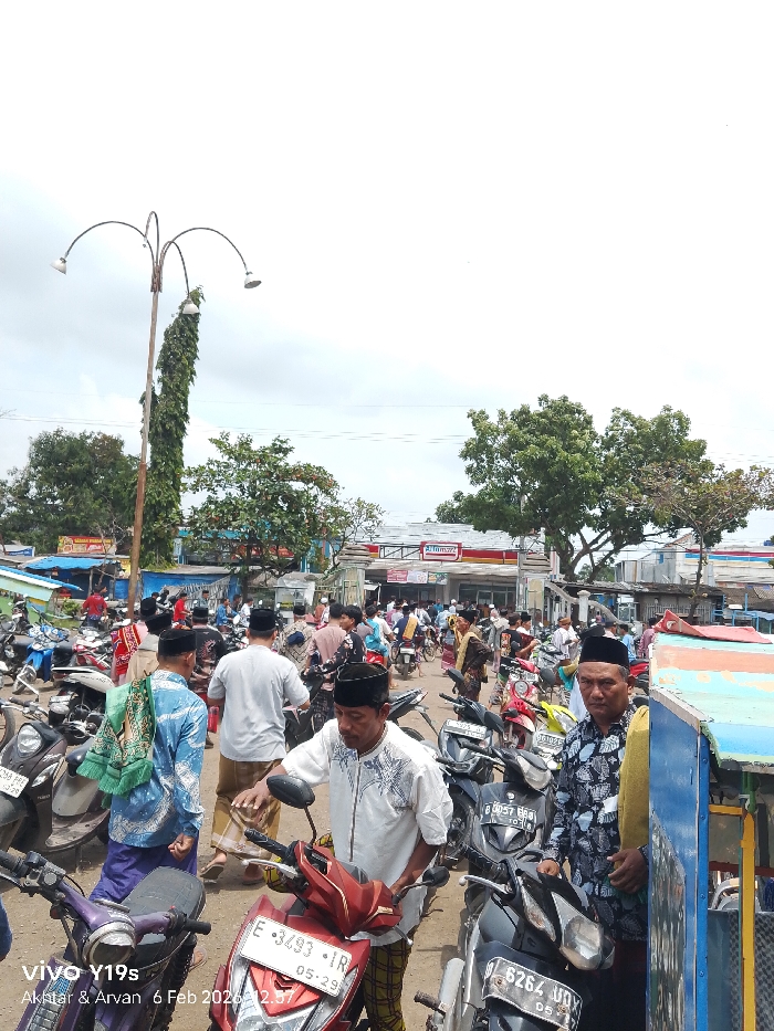 A crowded street scene features people wearing traditional Muslim attire, with many sporting black peci hats. A cluster of parked motorbikes fills the foreground, showing license plates. A tall lamp post wrapped in vines stands to the left. In the background, an “Alfamart” convenience store is visible. The image, captured with a Vivo Y19s, includes a timestamp of February 6, 2026.