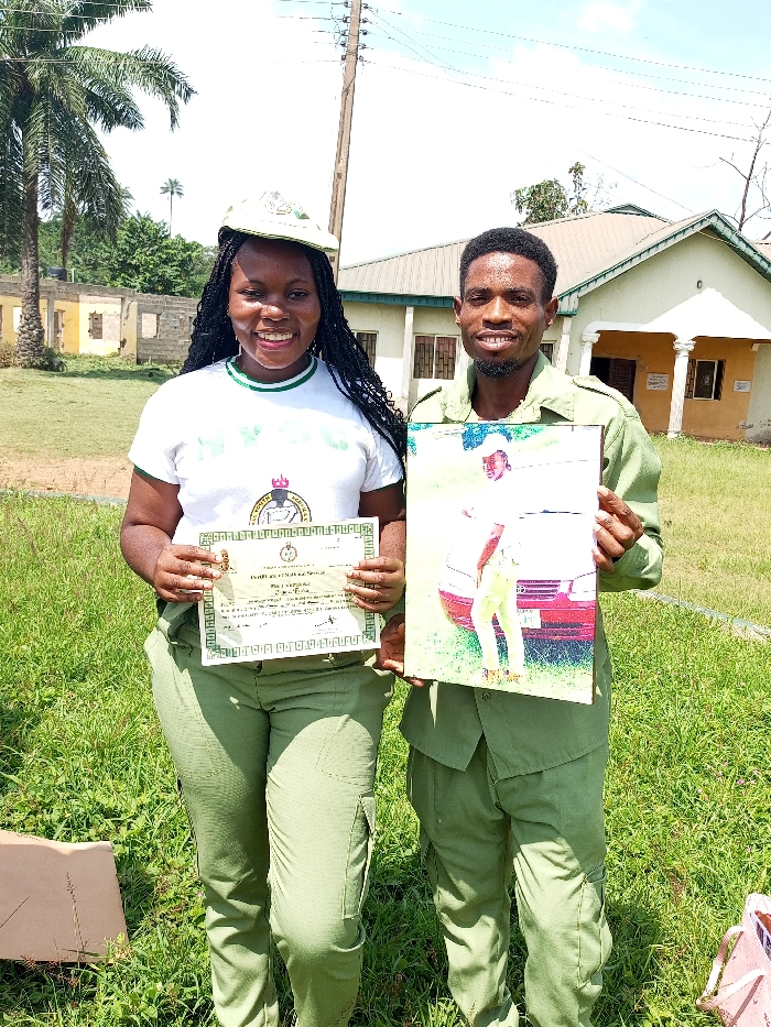 The scene depicts two individuals, one female and one male, standing outdoors on a sunny day in Aramoko-Ekiti, Nigeria. Both individuals, smiling, are positioned centrally and face the camera. The female, on the left, wears a white t-shirt with a green collar and trim, green cargo pants, and a green cap, indicative of a National Youth Service Corps (NYSC) uniform. She holds a document identified as a 'Certificate of National Service' in both hands. The male, on the right, wears a complete green uniform, consistent with the NYSC khaki uniform, and holds a framed photograph of an individual in a similar uniform standing next to a red vehicle. The background features a grassy area, a partially derelict light-colored building with open windows on the left, and a well-maintained cream-colored building with a dark roof and white pillars on the right. Palm trees, other green vegetation, utility poles, and power lines are visible under a clear blue sky. A cardboard box lies on the ground in the lower-left foreground.