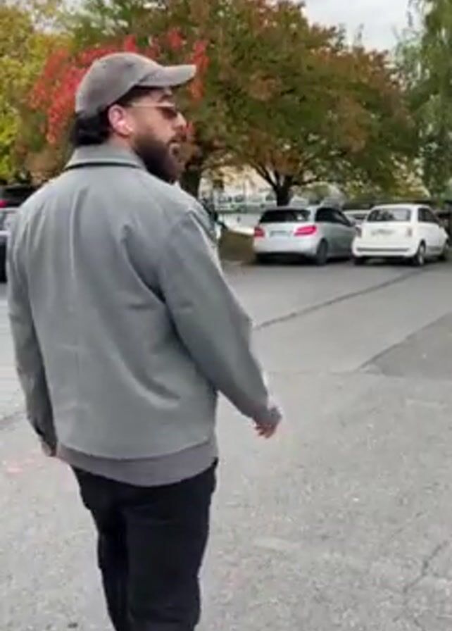 man in a grey jacket, black jeans, and white sneakers, with a beard and sunglasses, standing in a parking lot on a cloudy day
