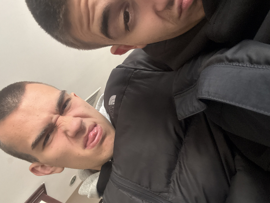 Two young adult males are depicted in an indoor setting, identified as the city of Devin, Bulgaria. The individual on the left, positioned prominently, has a light complexion and a short, buzz-cut hairstyle. He is wearing a black puffer jacket with "The North Face" logo visible on the left chest, layered over a light grey hooded sweatshirt. His face is contorted with furrowed eyebrows, a wrinkled nose, and his tongue partially extended, directed towards the camera. To the right, a second young adult male is partially visible, showing the right side of his face and upper torso. He also has a light complexion and a short, buzz-cut hairstyle, wearing dark clothing. His visible right eye is narrowed, and his mouth is formed into a downward pout. The background is a light-colored wall or ceiling, with a partial brown wooden frame visible in the upper left and a white ventilation grate in the upper right. The scene is illuminated by interior lighting.