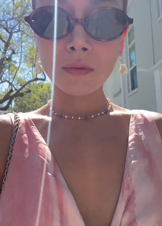 A woman with short purple hair and sunglasses is walking outside on a sunny day. She's wearing a pink tie-dye dress, a pearl necklace, and pearl earrings. She stops, takes off her sunglasses, looks directly into the camera, and smiles. The background shows a sidewalk, street, parked cars, trees, and buildings.