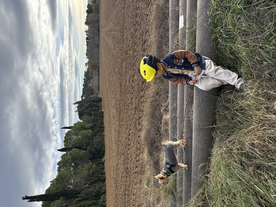 The image depicts an outdoor scene in a rural area of Rousset, France. In the foreground, three parallel, weathered light-colored wooden logs run horizontally, bordered by dry green and brown grass. A young boy is seated on the middle log on the right, wearing a yellow and black bicycle helmet, a dark blue and brown letterman jacket with a visible "S" on the left chest, a yellow undershirt, and light-colored trousers. He holds a thin, dark stick horizontally in his hands and looks towards the left. To his left, standing on the leftmost log, is a small, short-legged Yorkshire Terrier-type dog with salt-and-pepper fur, wearing a dark harness. The dog is looking intently towards the left, and a leash extends from its harness. Behind the logs and subjects, a large, tilled field of reddish-brown earth extends into the midground, marked by distinct furrows. The background features a dense line of tall, dark green coniferous trees on the left, transitioning to a line of deciduous trees displaying muted autumnal colors further right. The sky is overcast with a mix of light gray and white clouds.