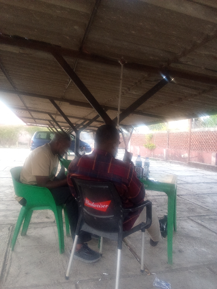 Two men sit at a green plastic table under a metal roof. One man wears a tan shirt and the other a red and black plaid shirt. A Budweiser logo is visible on the back of the second man's chair. Water bottles sit on the table between them. A blue car is parked in the background, along with a red brick wall with decorative metalwork. The ground is concrete.